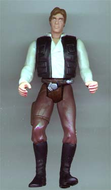 This custom figure just kind of spontaneously happened. I guess I got tired of seeing the Han Solo in Trenchcoat in my Endor Battle diorama. I used the Han Bespin head, torso, and legs, the Han Carbonite arms, and the pelvic piece from a regular Han (to give him the right belt). I used the Han Bespin torso because 1) I wanted to have Han with the double-breasted shirt he wore in the movie and 2) I liked the way the jacket didn't cling to his body (like the vest clings to the body of the regular POTF2 Han). Most of the work was painting, but I had to trim down the collar on the Han Bespin jacket to make it look like a vest, and I had to cut down the arms to make them less muscular. (And if you're curious, the arms are the same color as the shirt; the scan didn't get the colors quite right.)