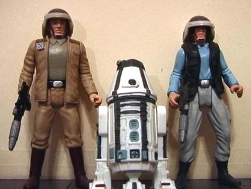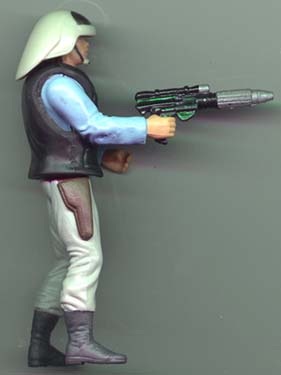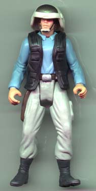 The helmet, vest, holster, hands, chin guard, and left-leg pocket are from the original Kenner figure (shown below). The legs are from Weequay. The pelvis is from Garindan. The arms and torso are from the Millennium Coin version of Jedi Luke. The head is the original "Buff" Luke version (none of my Lukes have this head any more, so I don't consider it a "Luke" head).