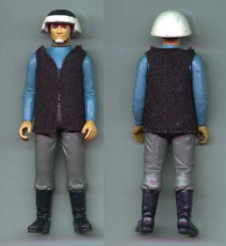 The main work on this figure involved cutting down the edges of the gloves so they looked like sleeves, and sanding them smooth. After that, I painted him. Not knowing any better at the time, I used Enamel paints (bad, bad Erik), so he has always remained just a little sticky. Last, I cut a nice loose vest for him from some black cargo pants.